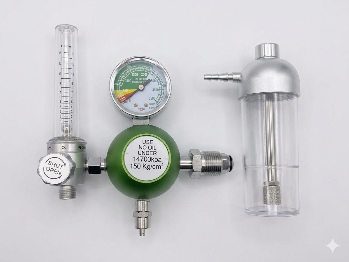 A medical-grade oxygen pressure regulator designed to safely control and deliver oxygen from cylinders. It reduces high cylinder pressure to a safe, stable level and allows precise adjustment of oxygen flow for patient use. Durable and reliable, it is suitable for hospitals, clinics, emergency care, and home oxygen therapy.