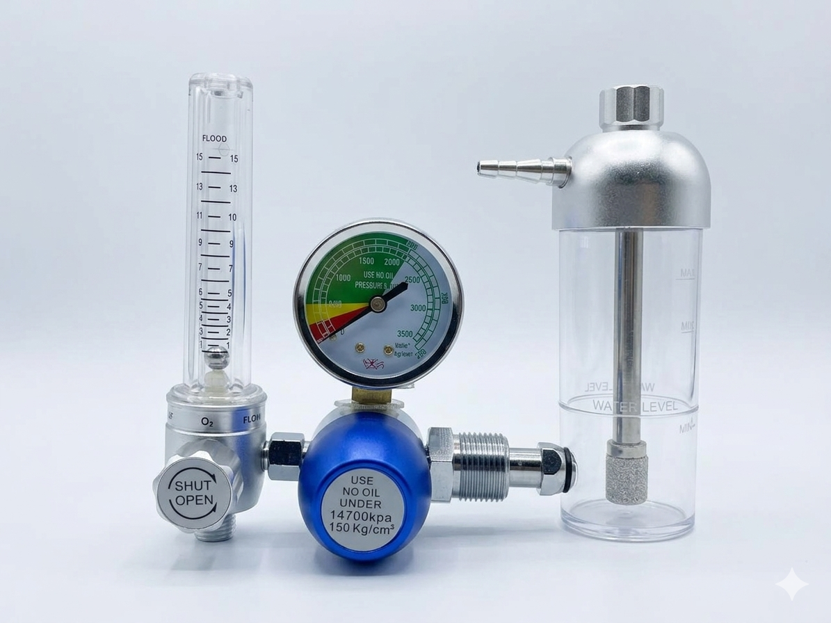 A high-quality medical oxygen regulator designed to safely manage and supply oxygen from cylinders. It lowers the high pressure from the cylinder to a safe, steady level and allows precise control of oxygen flow for patient care. Built for reliability and durability, it is ideal for hospitals, clinics, emergency services, and home oxygen therapy.
